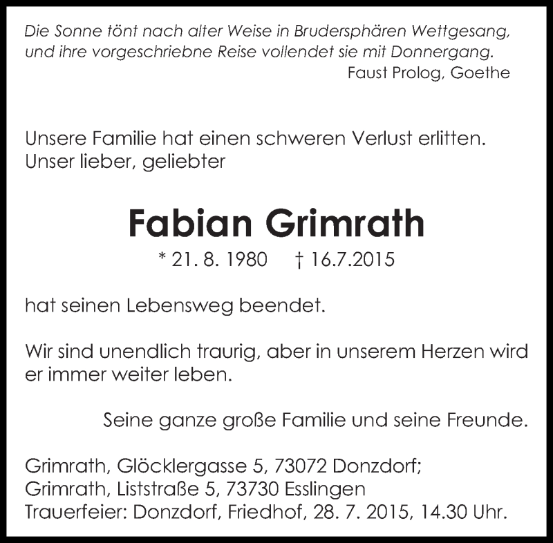 Hier finden Sie alle Traueranzeigen aus der Zeitung, die bisher für Fabian Grimrath erschienen sind. Weitere Traueranzeigen, die in der Zeitung erscheinen, werden hier ebenfalls aufgelistet