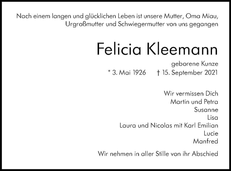 Hier finden Sie alle Traueranzeigen aus der Zeitung, die bisher für Felicia Kleemann erschienen sind. Weitere Traueranzeigen, die in der Zeitung erscheinen, werden hier ebenfalls aufgelistet