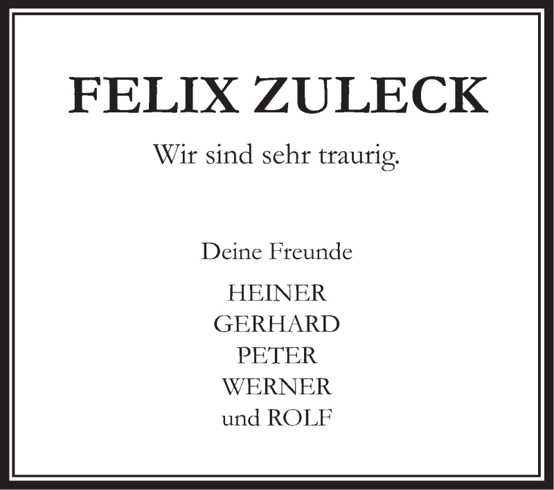 Hier finden Sie alle Traueranzeigen aus der Zeitung, die bisher für Felix Zuleck erschienen sind. Weitere Traueranzeigen, die in der Zeitung erscheinen, werden hier ebenfalls aufgelistet