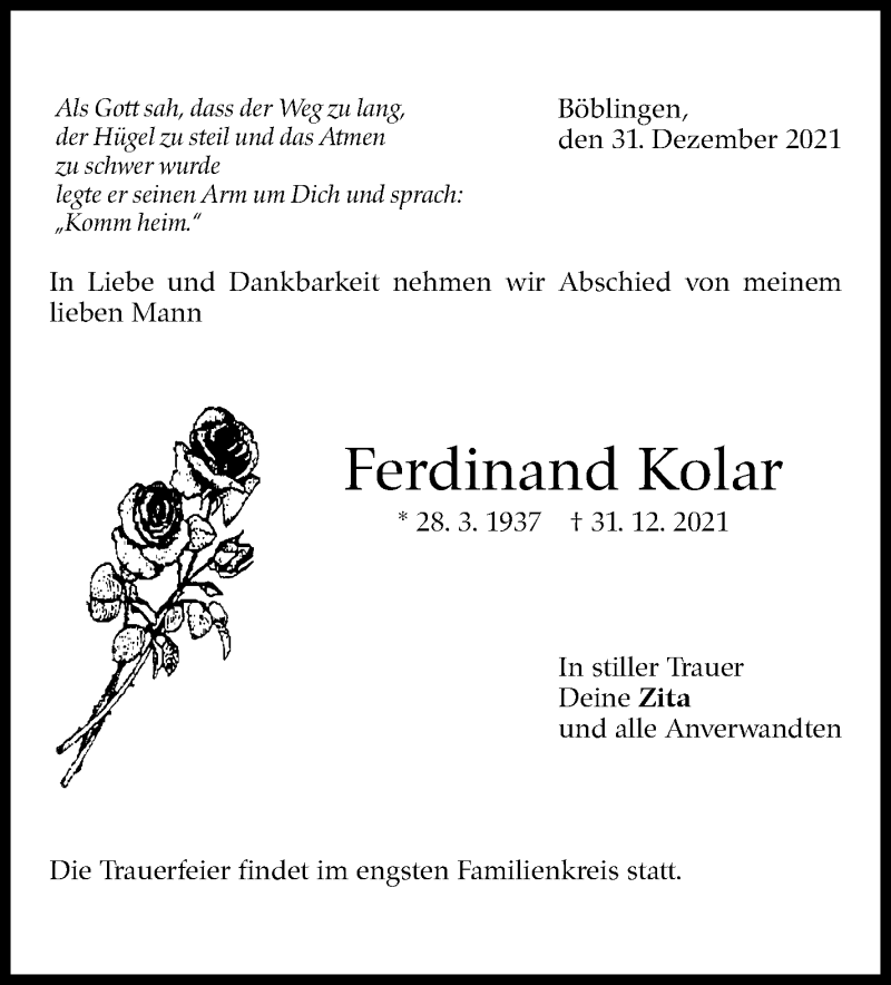 Hier finden Sie alle Traueranzeigen aus der Zeitung, die bisher für Ferdinand Kolar erschienen sind. Weitere Traueranzeigen, die in der Zeitung erscheinen, werden hier ebenfalls aufgelistet