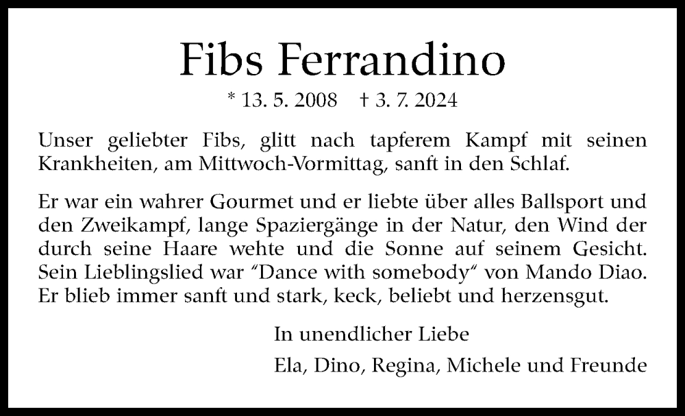 Hier finden Sie alle Traueranzeigen aus der Zeitung, die bisher für Fibs Ferrandino erschienen sind. Weitere Traueranzeigen, die in der Zeitung erscheinen, werden hier ebenfalls aufgelistet