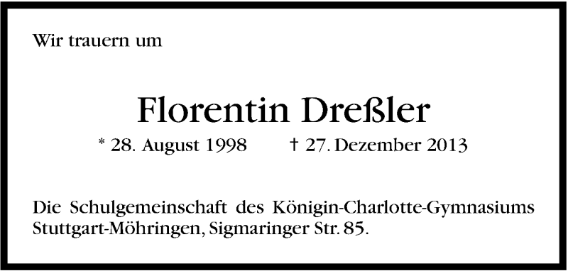 Hier finden Sie alle Traueranzeigen aus der Zeitung, die bisher für Florentin Dreßler erschienen sind. Weitere Traueranzeigen, die in der Zeitung erscheinen, werden hier ebenfalls aufgelistet