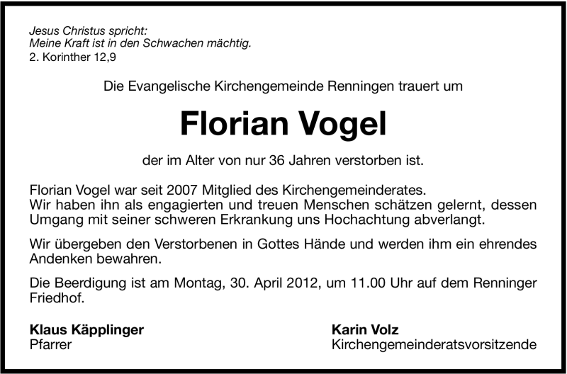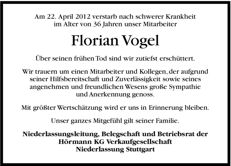 Hier finden Sie alle Traueranzeigen aus der Zeitung, die bisher für Florian Vogel erschienen sind. Weitere Traueranzeigen, die in der Zeitung erscheinen, werden hier ebenfalls aufgelistet
