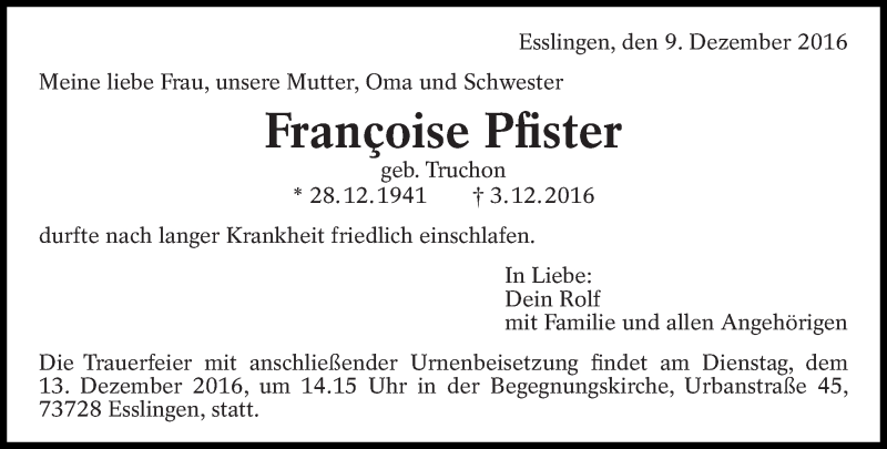 Hier finden Sie alle Traueranzeigen aus der Zeitung, die bisher für Françoise Pfister erschienen sind. Weitere Traueranzeigen, die in der Zeitung erscheinen, werden hier ebenfalls aufgelistet