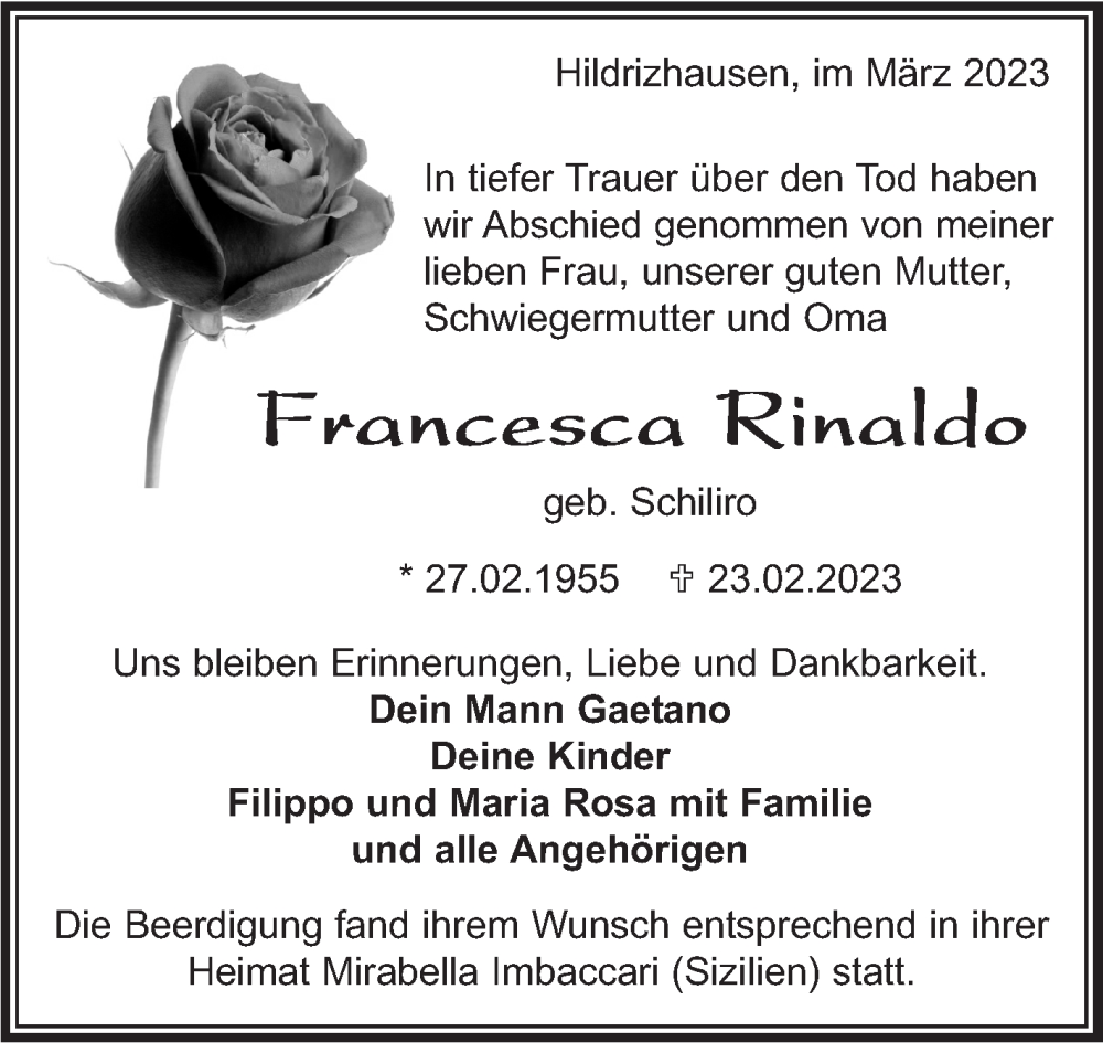 Hier finden Sie alle Traueranzeigen aus der Zeitung, die bisher für Francesca Rinaldo erschienen sind. Weitere Traueranzeigen, die in der Zeitung erscheinen, werden hier ebenfalls aufgelistet
