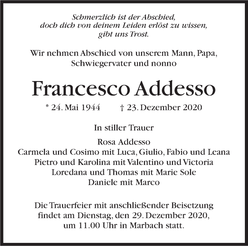 Hier finden Sie alle Traueranzeigen aus der Zeitung, die bisher für Francesco Addesso erschienen sind. Weitere Traueranzeigen, die in der Zeitung erscheinen, werden hier ebenfalls aufgelistet