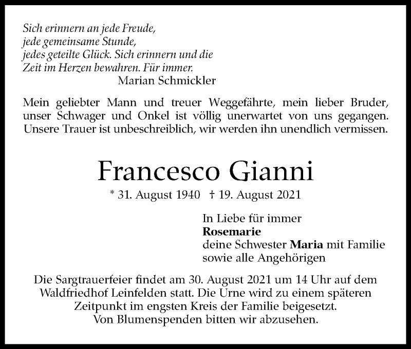 Hier finden Sie alle Traueranzeigen aus der Zeitung, die bisher für Francesco Gianni erschienen sind. Weitere Traueranzeigen, die in der Zeitung erscheinen, werden hier ebenfalls aufgelistet