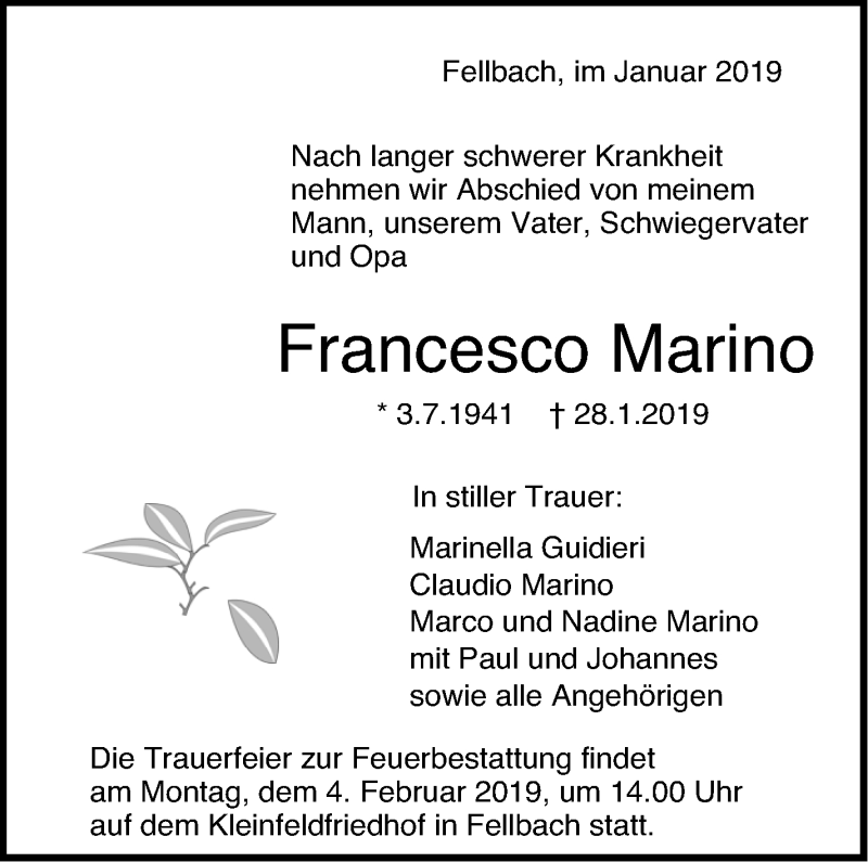 Hier finden Sie alle Traueranzeigen aus der Zeitung, die bisher für Francesco Marino erschienen sind. Weitere Traueranzeigen, die in der Zeitung erscheinen, werden hier ebenfalls aufgelistet