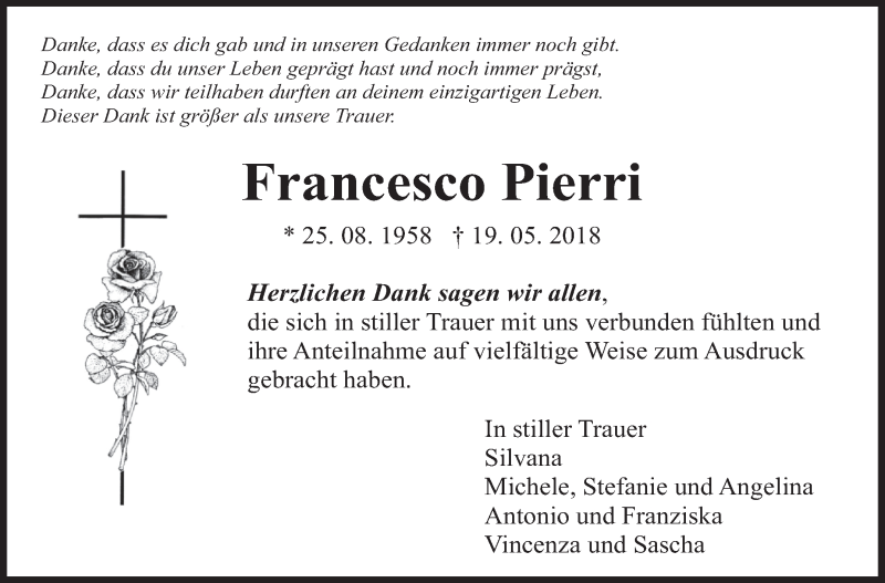 Hier finden Sie alle Traueranzeigen aus der Zeitung, die bisher für Francesco Pierri erschienen sind. Weitere Traueranzeigen, die in der Zeitung erscheinen, werden hier ebenfalls aufgelistet