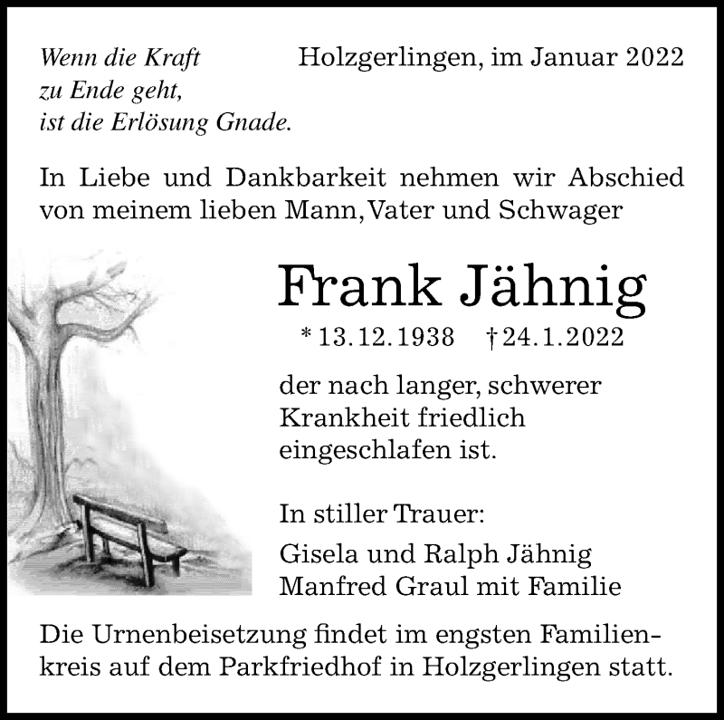 Hier finden Sie alle Traueranzeigen aus der Zeitung, die bisher für Frank Jähnig erschienen sind. Weitere Traueranzeigen, die in der Zeitung erscheinen, werden hier ebenfalls aufgelistet