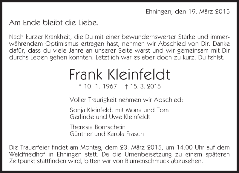Hier finden Sie alle Traueranzeigen aus der Zeitung, die bisher für Frank Kleinfeldt erschienen sind. Weitere Traueranzeigen, die in der Zeitung erscheinen, werden hier ebenfalls aufgelistet