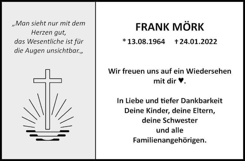 Hier finden Sie alle Traueranzeigen aus der Zeitung, die bisher für Frank Mörk erschienen sind. Weitere Traueranzeigen, die in der Zeitung erscheinen, werden hier ebenfalls aufgelistet