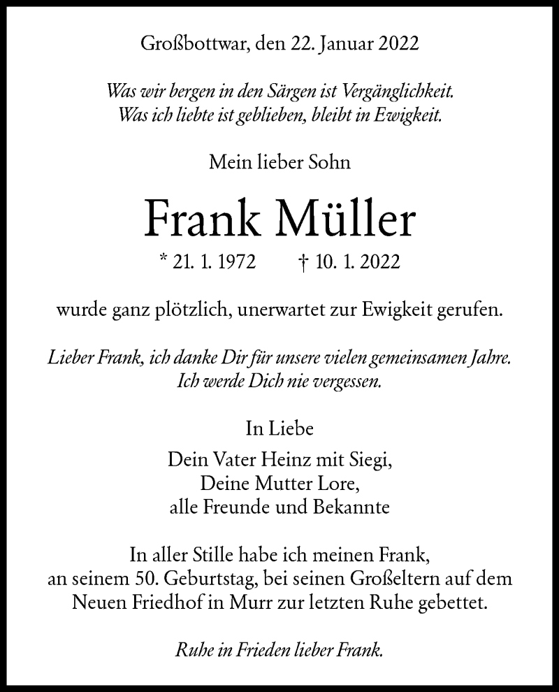 Hier finden Sie alle Traueranzeigen aus der Zeitung, die bisher für Frank Müller erschienen sind. Weitere Traueranzeigen, die in der Zeitung erscheinen, werden hier ebenfalls aufgelistet
