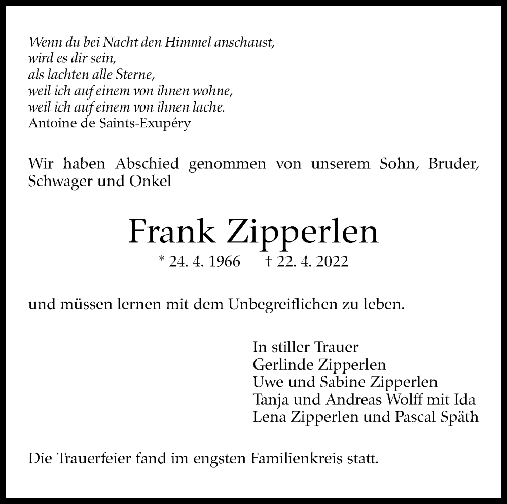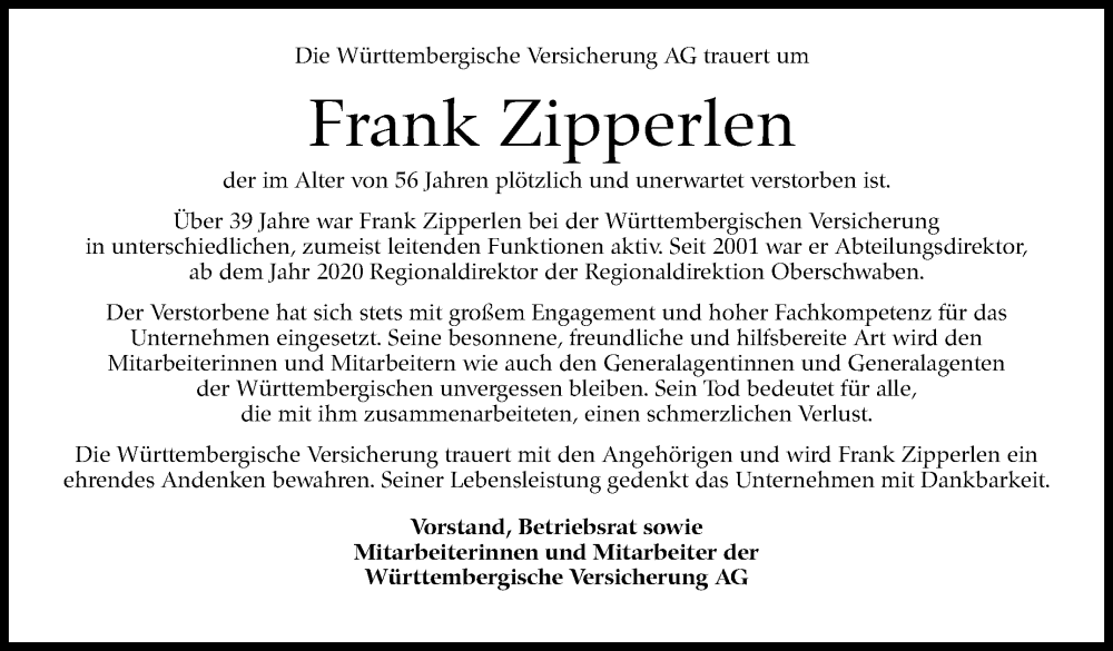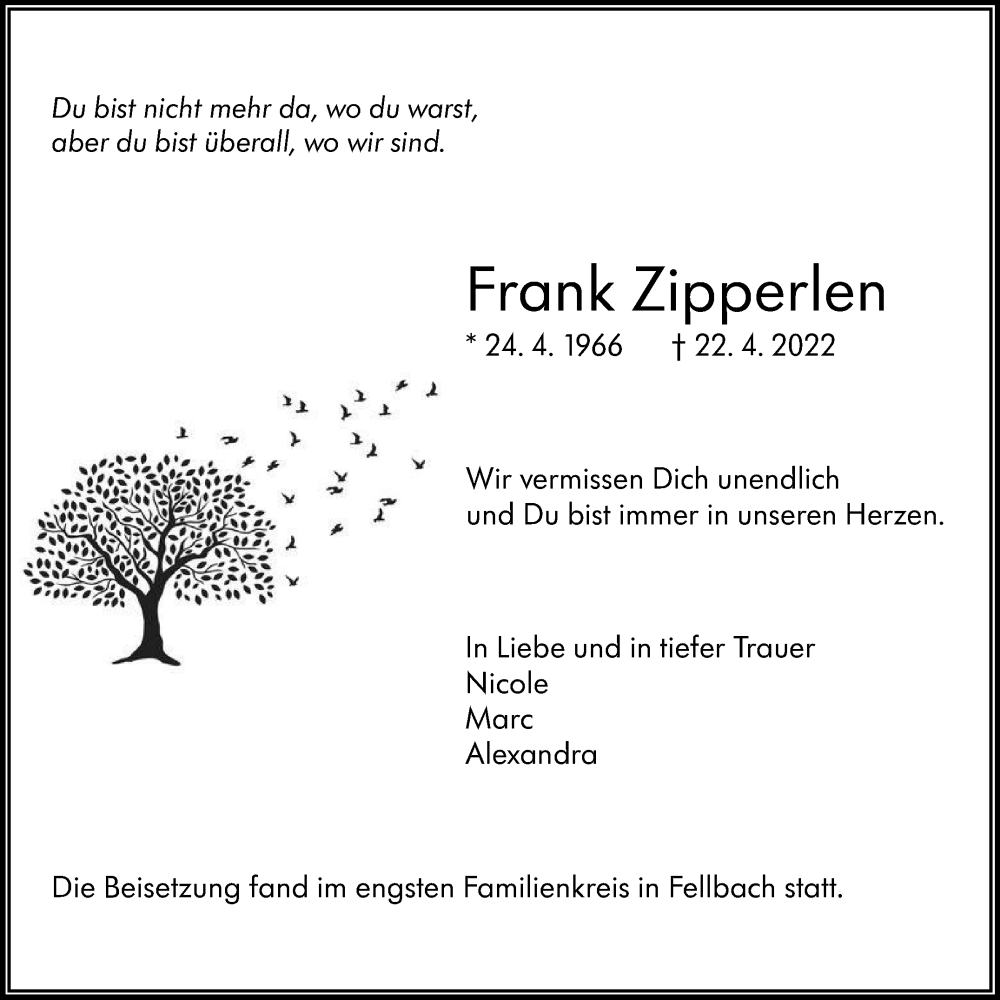 Hier finden Sie alle Traueranzeigen aus der Zeitung, die bisher für Frank Zipperlen erschienen sind. Weitere Traueranzeigen, die in der Zeitung erscheinen, werden hier ebenfalls aufgelistet