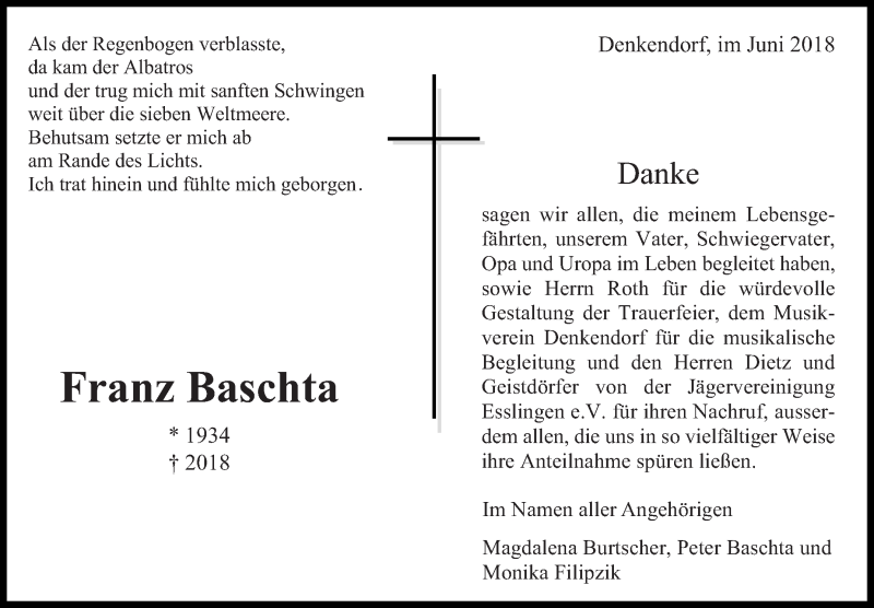 Hier finden Sie alle Traueranzeigen aus der Zeitung, die bisher für Franz Baschta erschienen sind. Weitere Traueranzeigen, die in der Zeitung erscheinen, werden hier ebenfalls aufgelistet