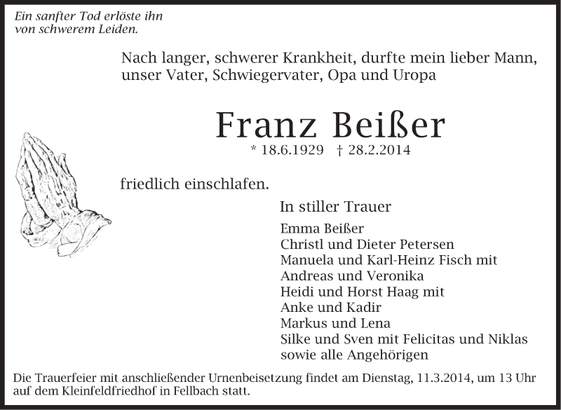 Hier finden Sie alle Traueranzeigen aus der Zeitung, die bisher für Franz Beißer erschienen sind. Weitere Traueranzeigen, die in der Zeitung erscheinen, werden hier ebenfalls aufgelistet