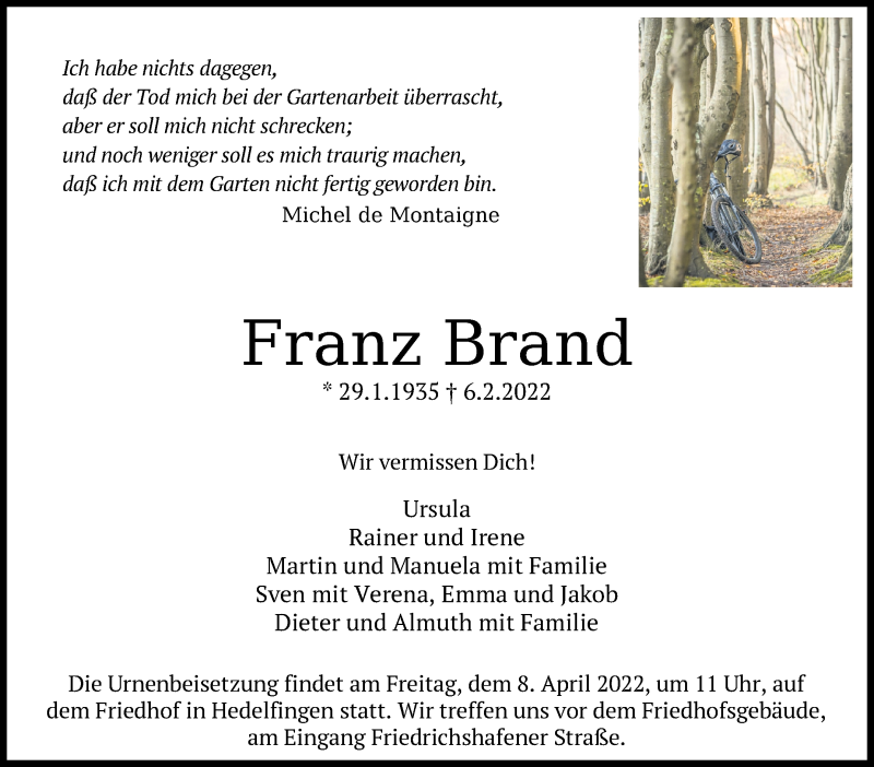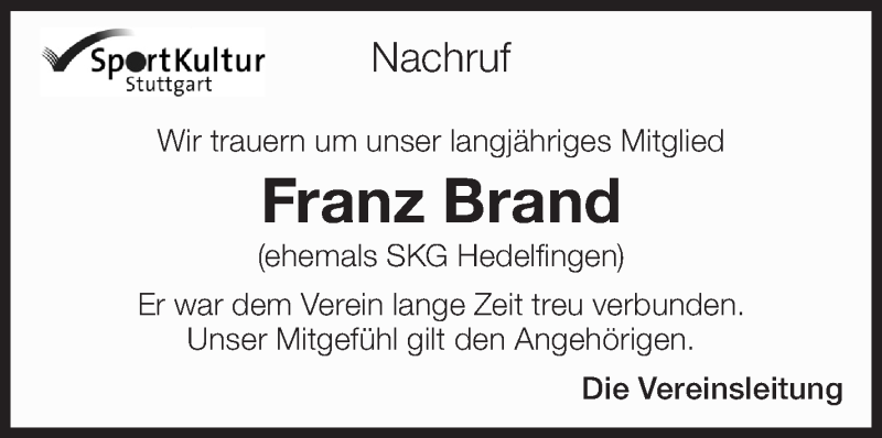 Hier finden Sie alle Traueranzeigen aus der Zeitung, die bisher für Franz Brand erschienen sind. Weitere Traueranzeigen, die in der Zeitung erscheinen, werden hier ebenfalls aufgelistet