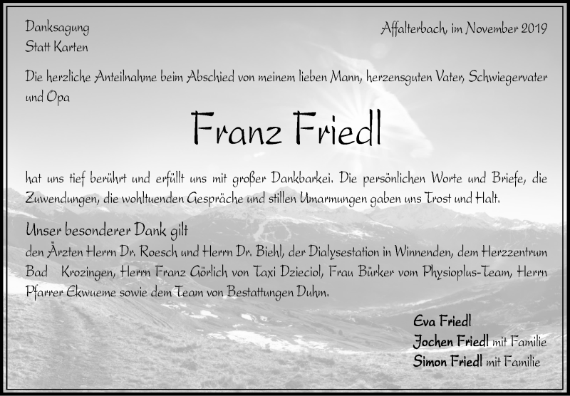 Hier finden Sie alle Traueranzeigen aus der Zeitung, die bisher für Franz Friedl erschienen sind. Weitere Traueranzeigen, die in der Zeitung erscheinen, werden hier ebenfalls aufgelistet