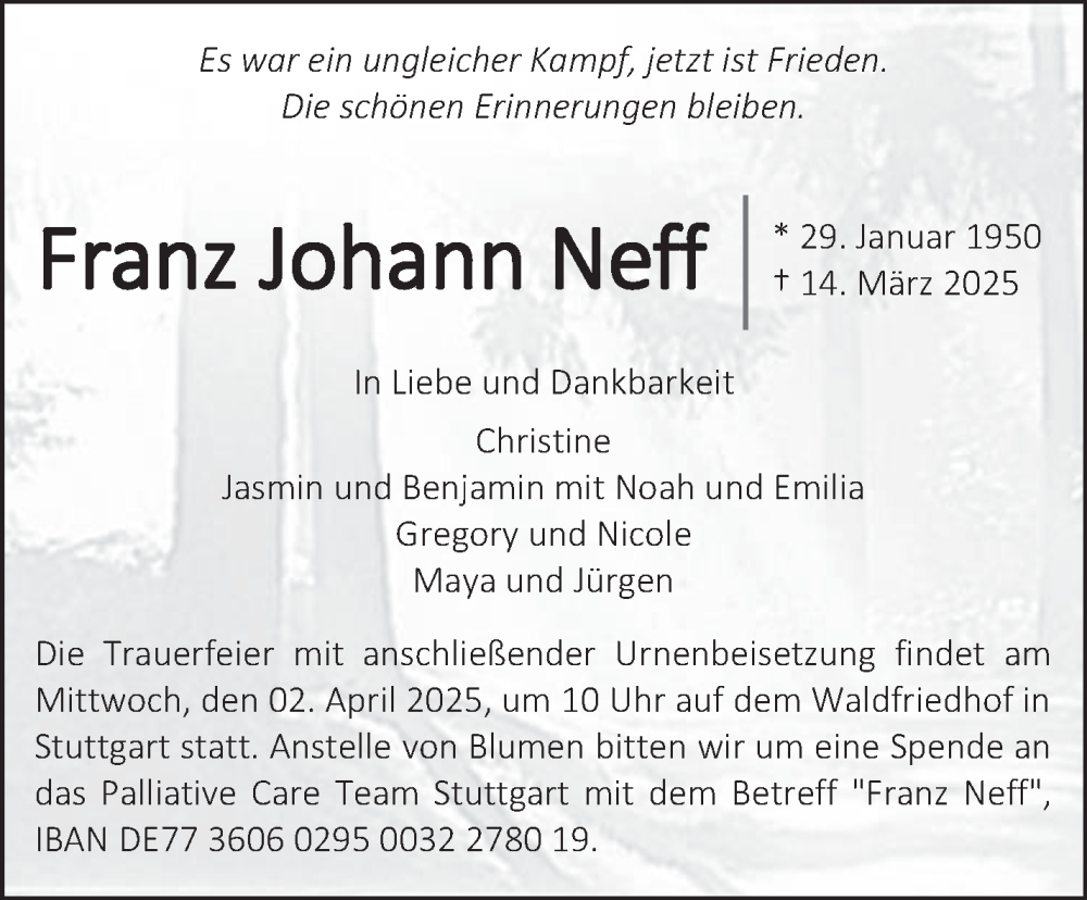 Hier finden Sie alle Traueranzeigen aus der Zeitung, die bisher für Franz Johann Neff erschienen sind. Weitere Traueranzeigen, die in der Zeitung erscheinen, werden hier ebenfalls aufgelistet