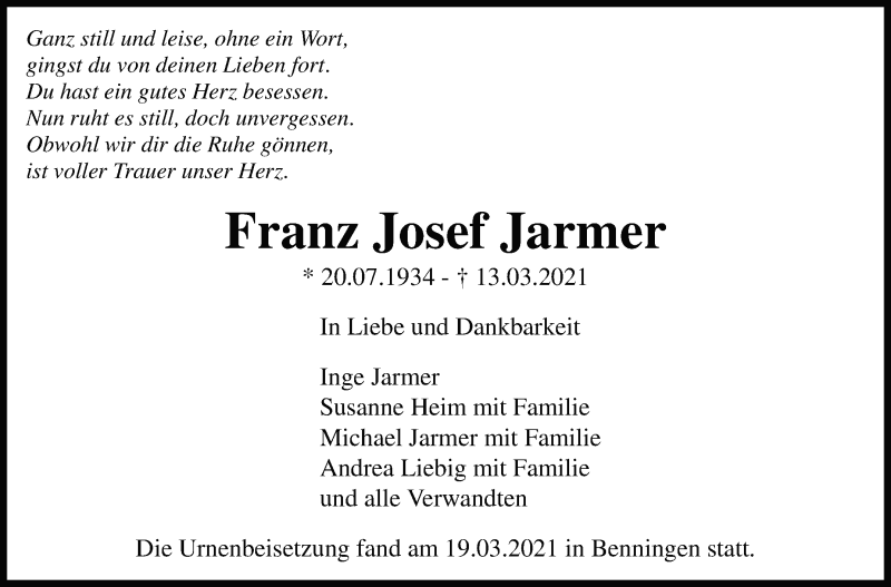 Hier finden Sie alle Traueranzeigen aus der Zeitung, die bisher für Franz Josef Jarmer erschienen sind. Weitere Traueranzeigen, die in der Zeitung erscheinen, werden hier ebenfalls aufgelistet