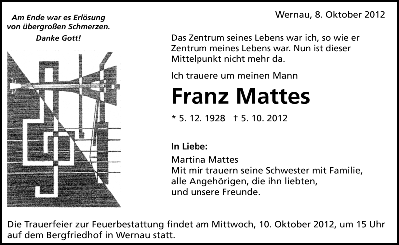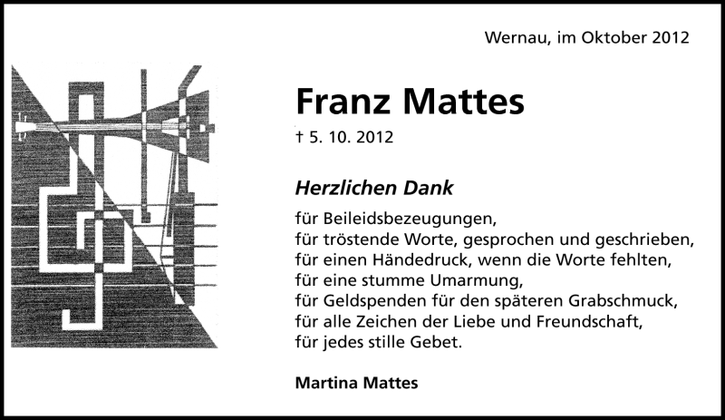 Hier finden Sie alle Traueranzeigen aus der Zeitung, die bisher für Franz Mattes erschienen sind. Weitere Traueranzeigen, die in der Zeitung erscheinen, werden hier ebenfalls aufgelistet
