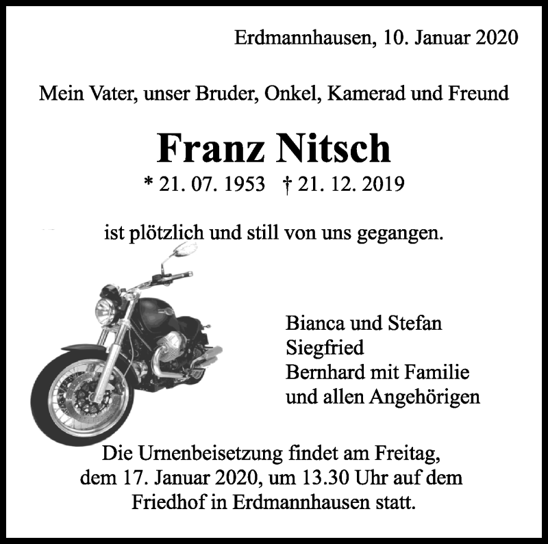 Hier finden Sie alle Traueranzeigen aus der Zeitung, die bisher für Franz Nitsch erschienen sind. Weitere Traueranzeigen, die in der Zeitung erscheinen, werden hier ebenfalls aufgelistet