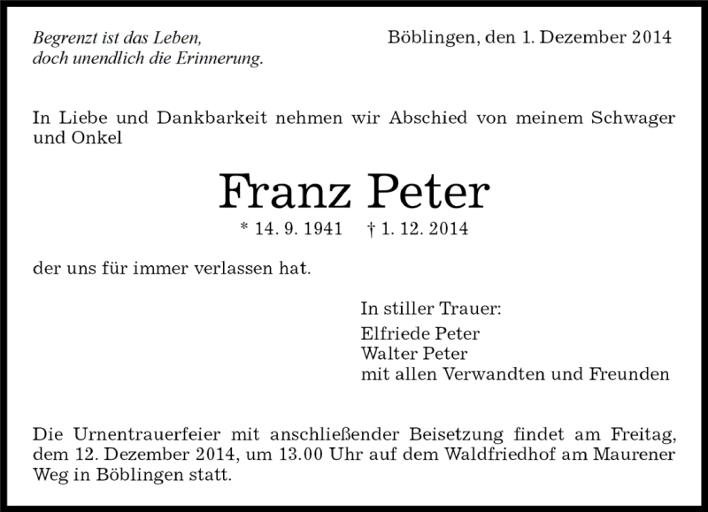Hier finden Sie alle Traueranzeigen aus der Zeitung, die bisher für Franz Peter erschienen sind. Weitere Traueranzeigen, die in der Zeitung erscheinen, werden hier ebenfalls aufgelistet