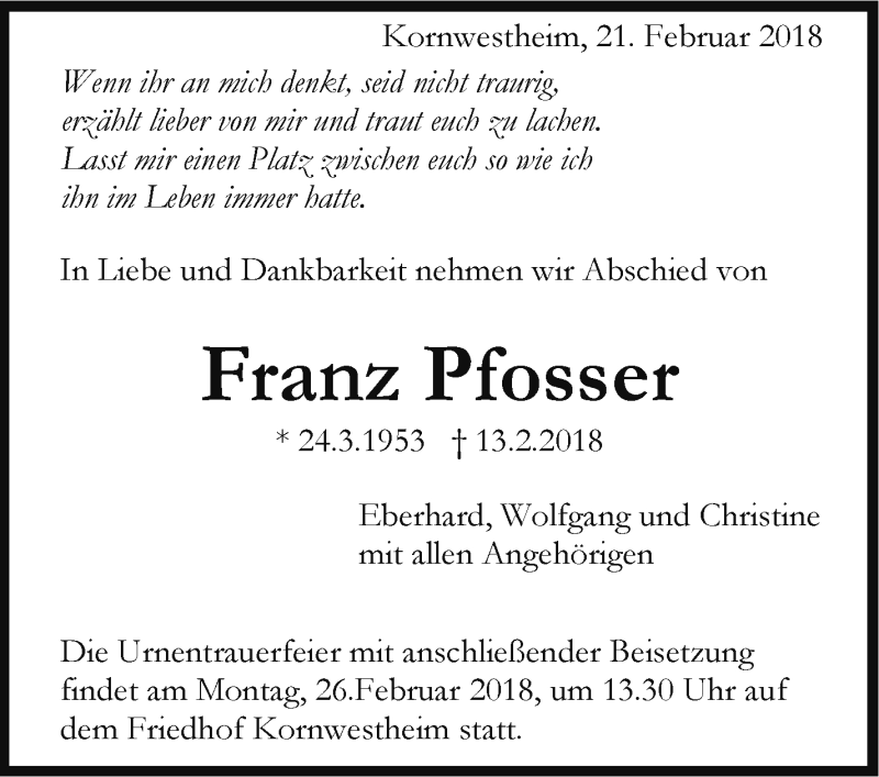 Hier finden Sie alle Traueranzeigen aus der Zeitung, die bisher für Franz Pfosser erschienen sind. Weitere Traueranzeigen, die in der Zeitung erscheinen, werden hier ebenfalls aufgelistet