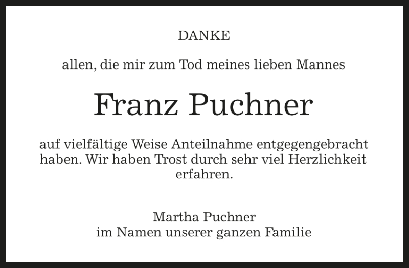 Hier finden Sie alle Traueranzeigen aus der Zeitung, die bisher für Franz Puchner erschienen sind. Weitere Traueranzeigen, die in der Zeitung erscheinen, werden hier ebenfalls aufgelistet
