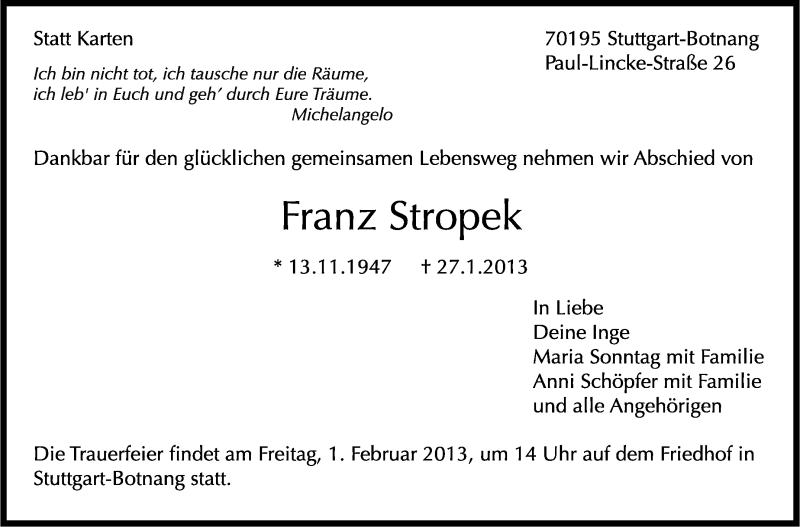 Hier finden Sie alle Traueranzeigen aus der Zeitung, die bisher für Franz Stropek erschienen sind. Weitere Traueranzeigen, die in der Zeitung erscheinen, werden hier ebenfalls aufgelistet