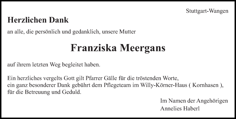 Hier finden Sie alle Traueranzeigen aus der Zeitung, die bisher für Franziska Meergans erschienen sind. Weitere Traueranzeigen, die in der Zeitung erscheinen, werden hier ebenfalls aufgelistet