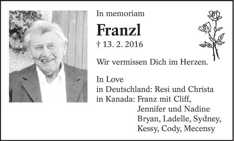 Hier finden Sie alle Traueranzeigen aus der Zeitung, die bisher für Franzl erschienen sind. Weitere Traueranzeigen, die in der Zeitung erscheinen, werden hier ebenfalls aufgelistet