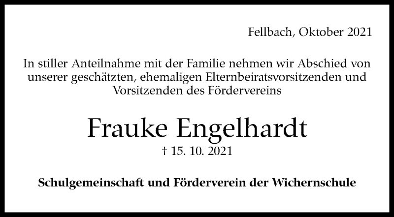 Hier finden Sie alle Traueranzeigen aus der Zeitung, die bisher für Frauke Engelhardt erschienen sind. Weitere Traueranzeigen, die in der Zeitung erscheinen, werden hier ebenfalls aufgelistet