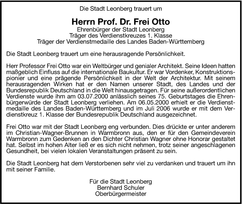Hier finden Sie alle Traueranzeigen aus der Zeitung, die bisher für Frei Otto erschienen sind. Weitere Traueranzeigen, die in der Zeitung erscheinen, werden hier ebenfalls aufgelistet