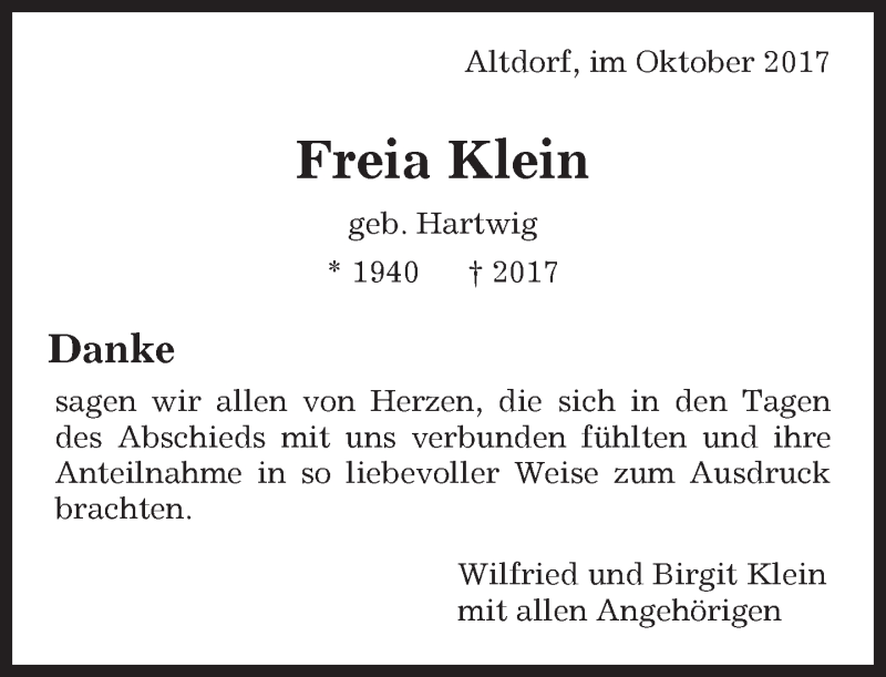 Hier finden Sie alle Traueranzeigen aus der Zeitung, die bisher für Freia Klein erschienen sind. Weitere Traueranzeigen, die in der Zeitung erscheinen, werden hier ebenfalls aufgelistet