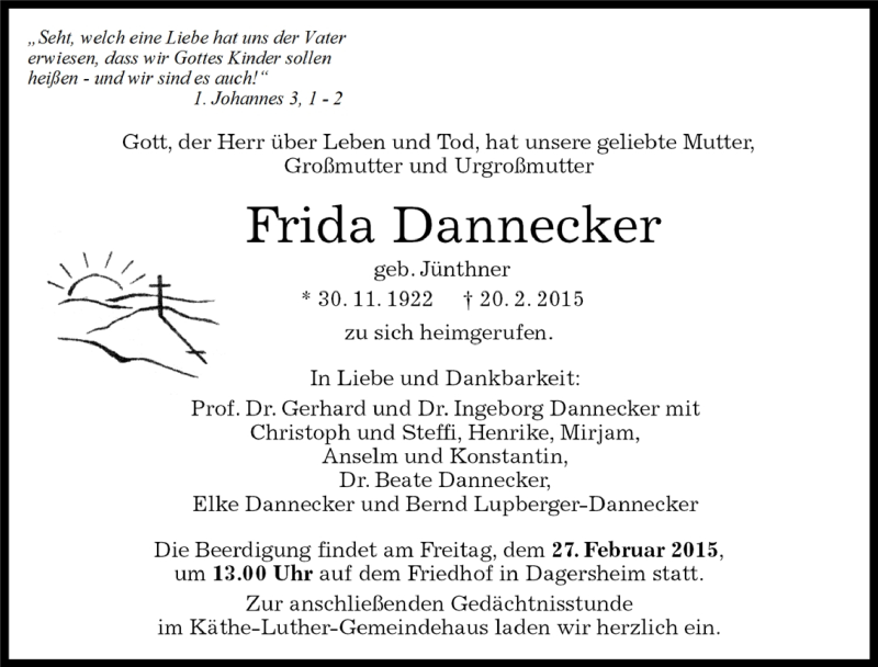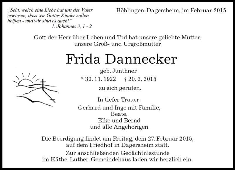 Hier finden Sie alle Traueranzeigen aus der Zeitung, die bisher für Frida Dannecker erschienen sind. Weitere Traueranzeigen, die in der Zeitung erscheinen, werden hier ebenfalls aufgelistet