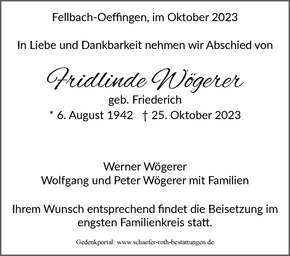 Hier finden Sie alle Traueranzeigen aus der Zeitung, die bisher für Fridlinde Wögerer erschienen sind. Weitere Traueranzeigen, die in der Zeitung erscheinen, werden hier ebenfalls aufgelistet