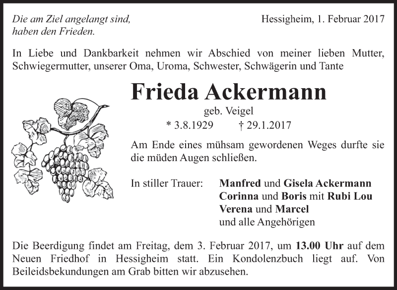 Hier finden Sie alle Traueranzeigen aus der Zeitung, die bisher für Frieda Ackermann erschienen sind. Weitere Traueranzeigen, die in der Zeitung erscheinen, werden hier ebenfalls aufgelistet