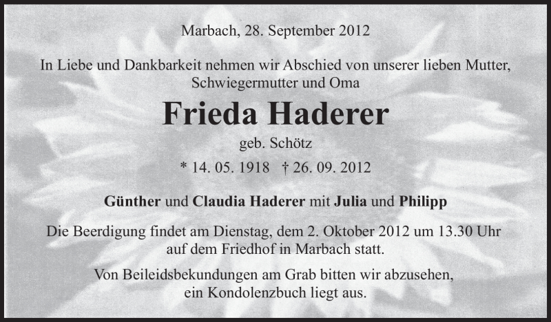 Hier finden Sie alle Traueranzeigen aus der Zeitung, die bisher für Frieda Haderer erschienen sind. Weitere Traueranzeigen, die in der Zeitung erscheinen, werden hier ebenfalls aufgelistet
