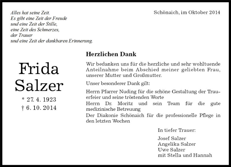 Hier finden Sie alle Traueranzeigen aus der Zeitung, die bisher für Frieda Salzer erschienen sind. Weitere Traueranzeigen, die in der Zeitung erscheinen, werden hier ebenfalls aufgelistet