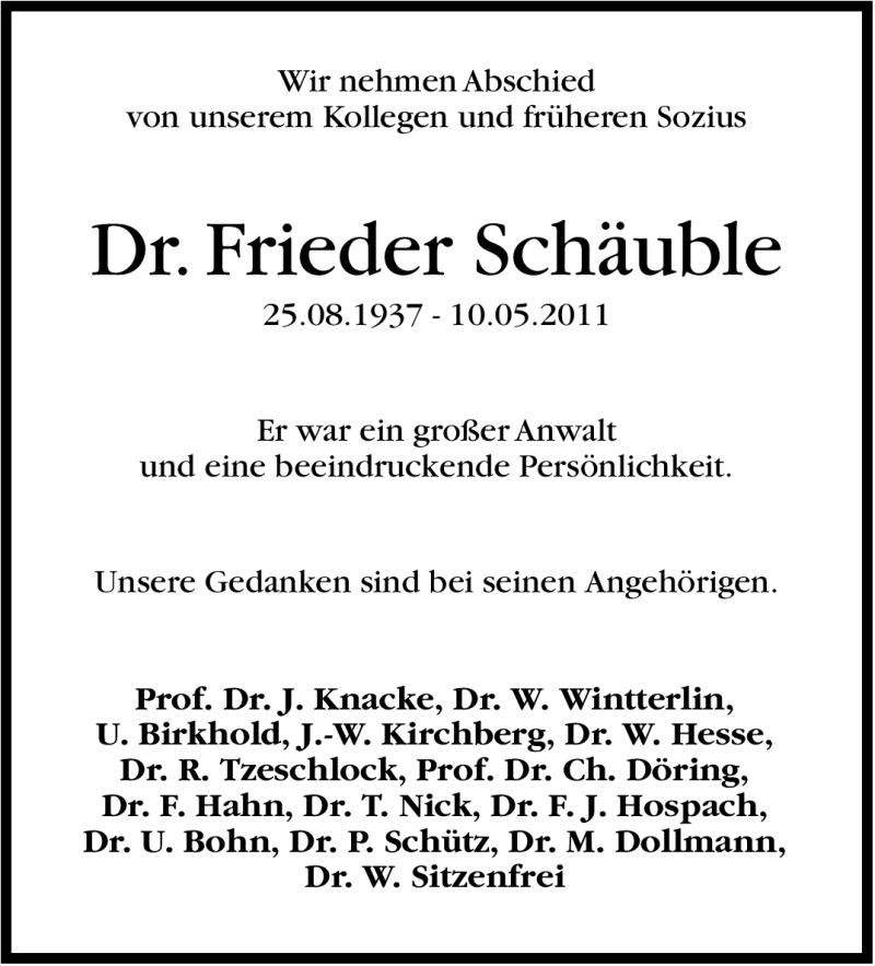 Hier finden Sie alle Traueranzeigen aus der Zeitung, die bisher für Frieder Schäuble erschienen sind. Weitere Traueranzeigen, die in der Zeitung erscheinen, werden hier ebenfalls aufgelistet