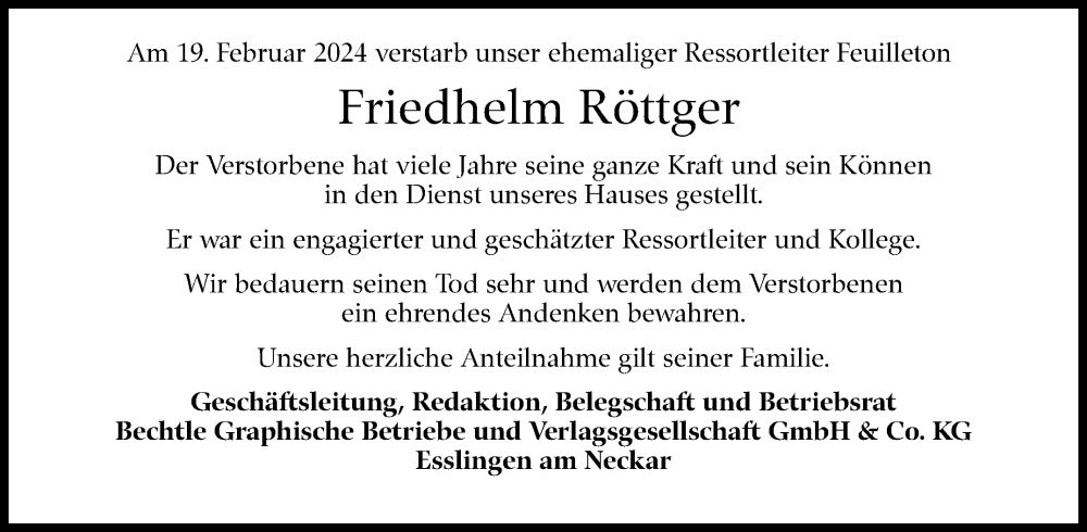 Hier finden Sie alle Traueranzeigen aus der Zeitung, die bisher für Friedhelm Röttger erschienen sind. Weitere Traueranzeigen, die in der Zeitung erscheinen, werden hier ebenfalls aufgelistet