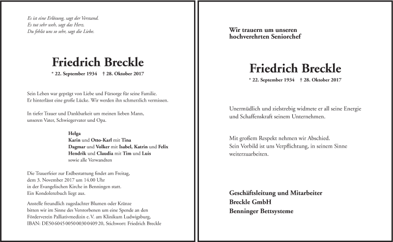 Hier finden Sie alle Traueranzeigen aus der Zeitung, die bisher für Friedrich Breckle erschienen sind. Weitere Traueranzeigen, die in der Zeitung erscheinen, werden hier ebenfalls aufgelistet