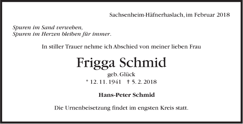 Hier finden Sie alle Traueranzeigen aus der Zeitung, die bisher für Frigga Schmid erschienen sind. Weitere Traueranzeigen, die in der Zeitung erscheinen, werden hier ebenfalls aufgelistet