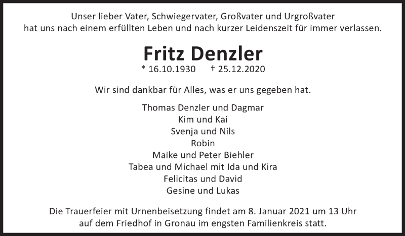 Hier finden Sie alle Traueranzeigen aus der Zeitung, die bisher für Fritz Denzler erschienen sind. Weitere Traueranzeigen, die in der Zeitung erscheinen, werden hier ebenfalls aufgelistet