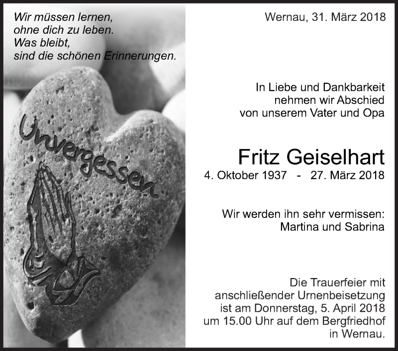 Hier finden Sie alle Traueranzeigen aus der Zeitung, die bisher für Fritz Geiselhart erschienen sind. Weitere Traueranzeigen, die in der Zeitung erscheinen, werden hier ebenfalls aufgelistet