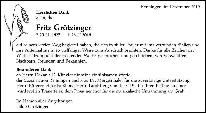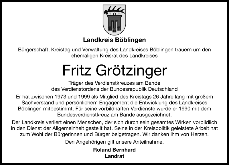 Hier finden Sie alle Traueranzeigen aus der Zeitung, die bisher für Fritz Grötzinger erschienen sind. Weitere Traueranzeigen, die in der Zeitung erscheinen, werden hier ebenfalls aufgelistet
