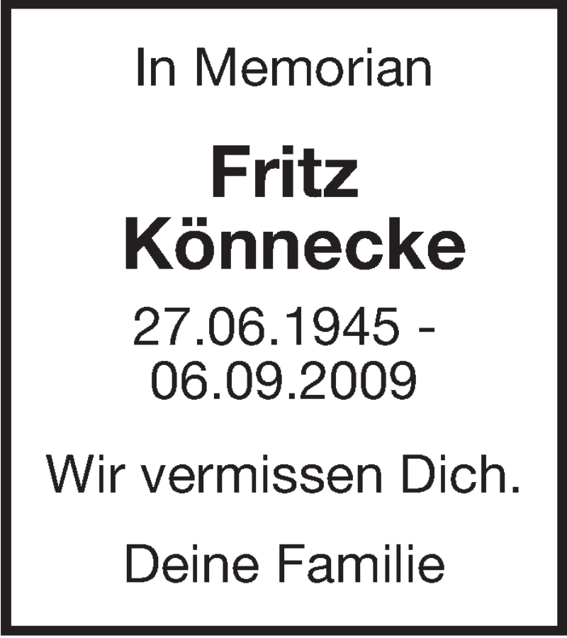 Hier finden Sie alle Traueranzeigen aus der Zeitung, die bisher für Fritz Könnecke erschienen sind. Weitere Traueranzeigen, die in der Zeitung erscheinen, werden hier ebenfalls aufgelistet