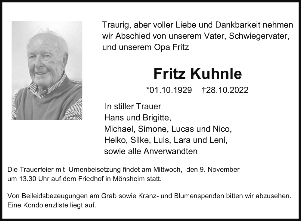 Hier finden Sie alle Traueranzeigen aus der Zeitung, die bisher für Fritz Kuhnle erschienen sind. Weitere Traueranzeigen, die in der Zeitung erscheinen, werden hier ebenfalls aufgelistet