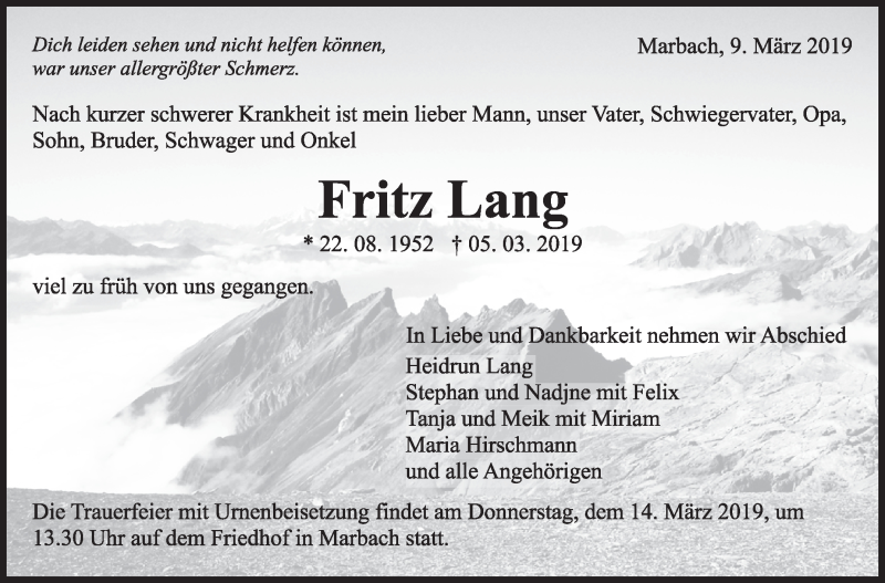 Hier finden Sie alle Traueranzeigen aus der Zeitung, die bisher für Fritz Lang erschienen sind. Weitere Traueranzeigen, die in der Zeitung erscheinen, werden hier ebenfalls aufgelistet